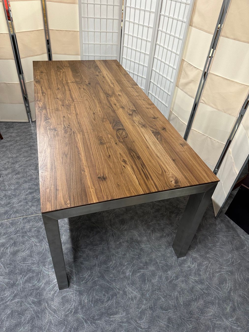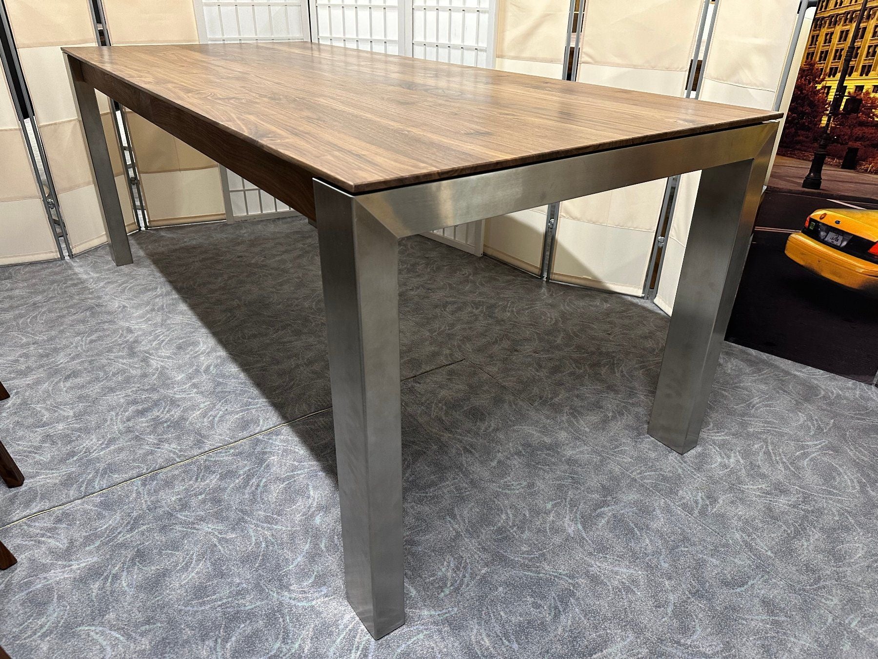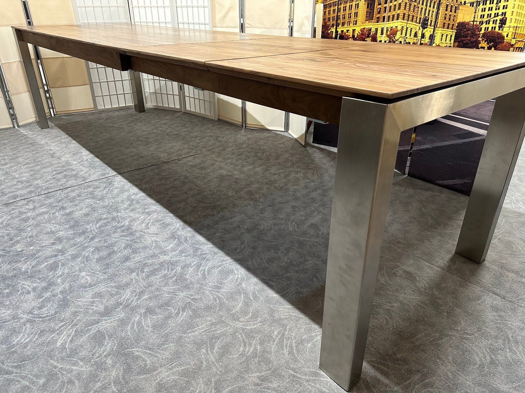 Esstisch «Celina» von Dudinger, rustikaler amerikanischer Nussbaum vollmassiv , Beine Edelstahl gebürstet, Beinprofil 6 x 10 cm, Plattenstärke 3 cm.