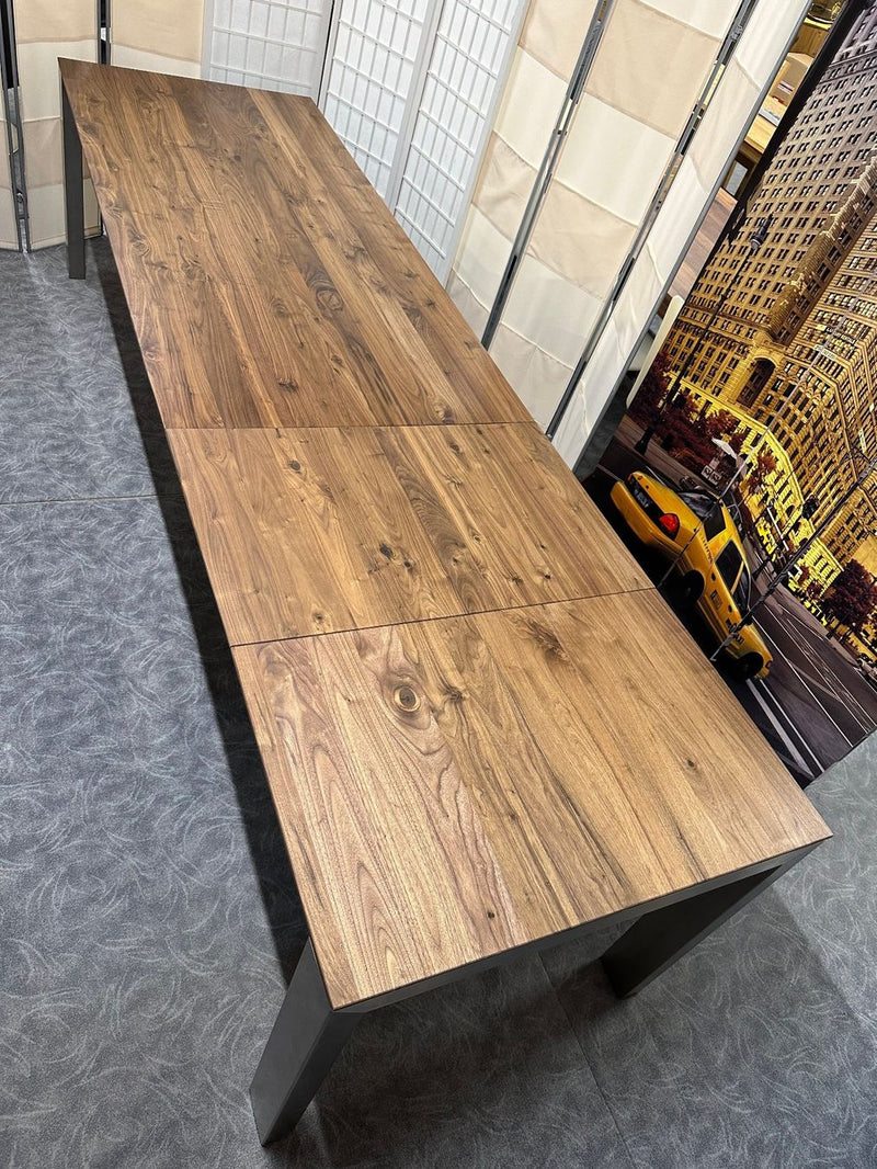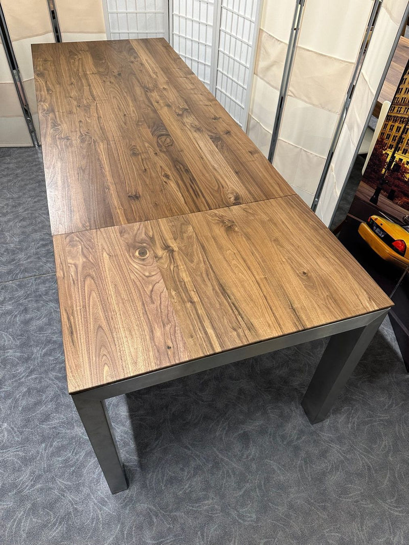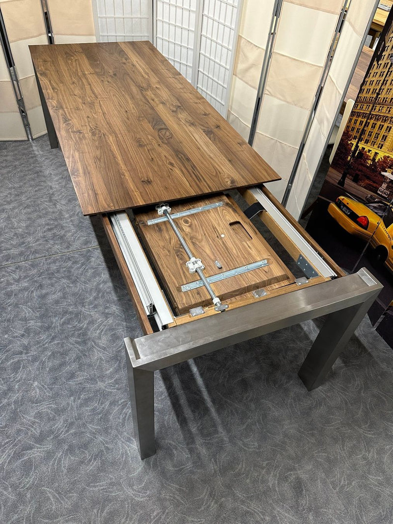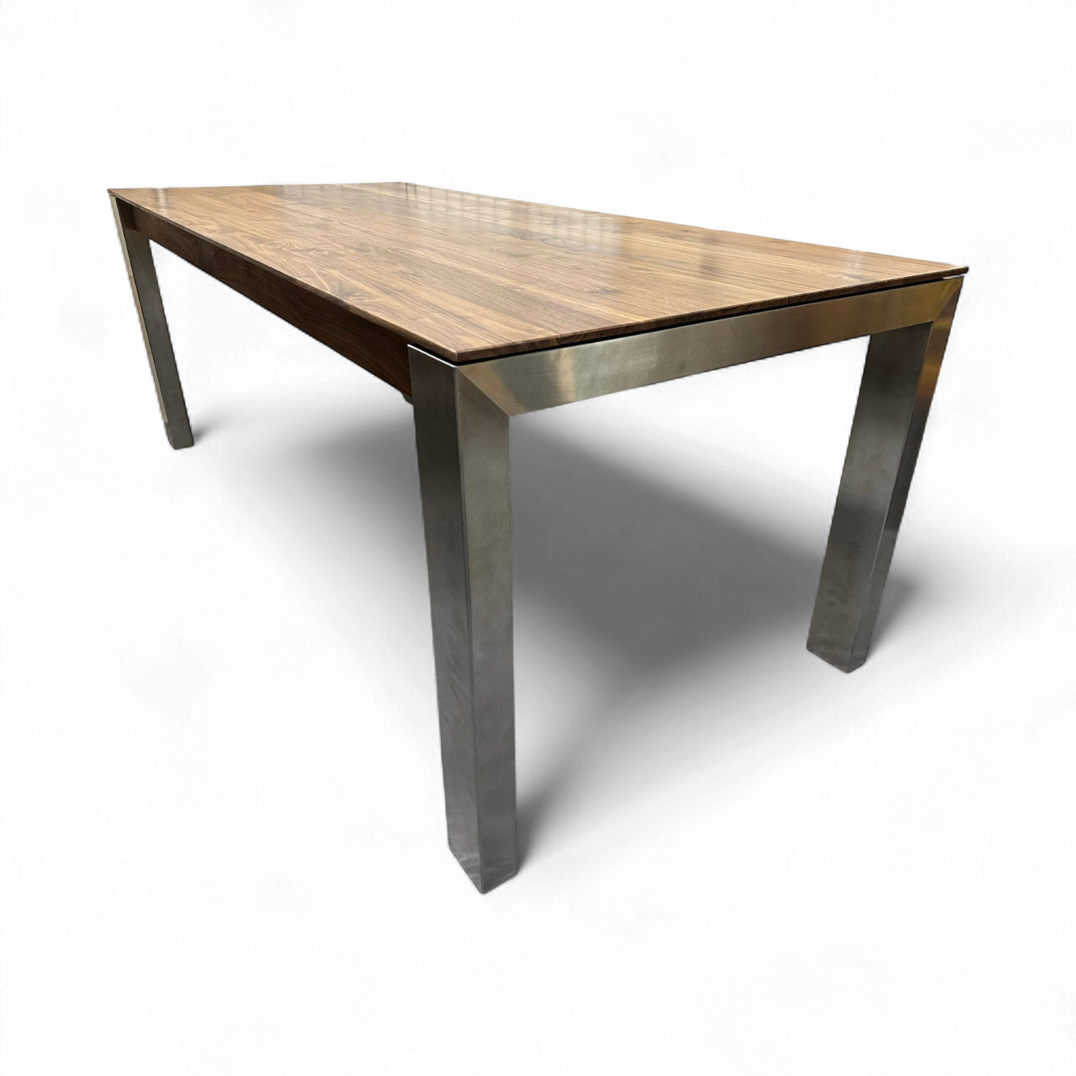 Esstisch «Celina» von Dudinger, rustikaler amerikanischer Nussbaum vollmassiv , Beine Edelstahl gebürstet, Beinprofil 6 x 10 cm, Plattenstärke 3 cm.