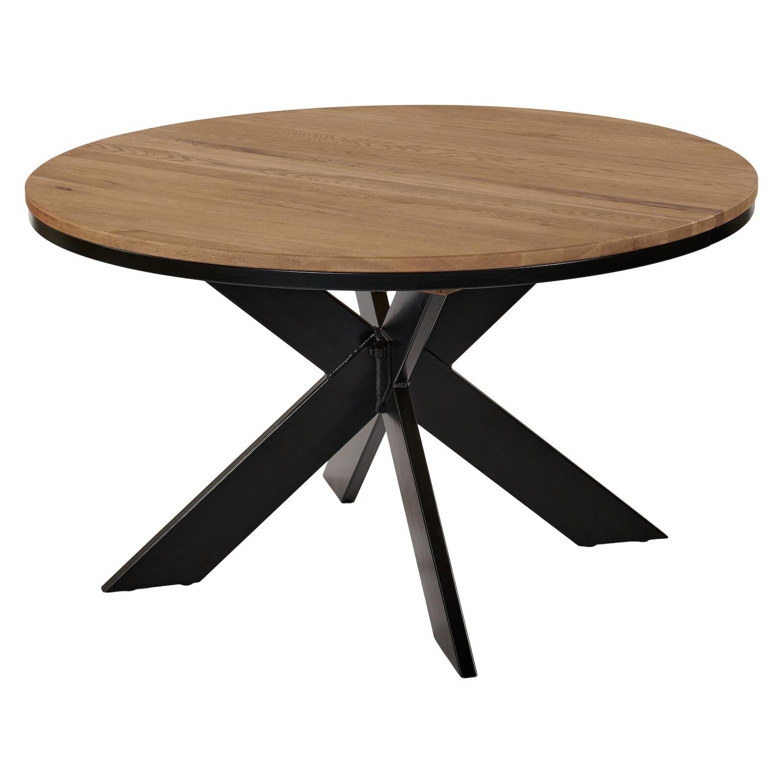 Tisch «Notting Hill» aus Wildeiche vollmassiv, Bianco lackiert. Fuss Stahl schwarz antik lackiert. Tischplatte streifenverleimt (keine Parkettverleimung).