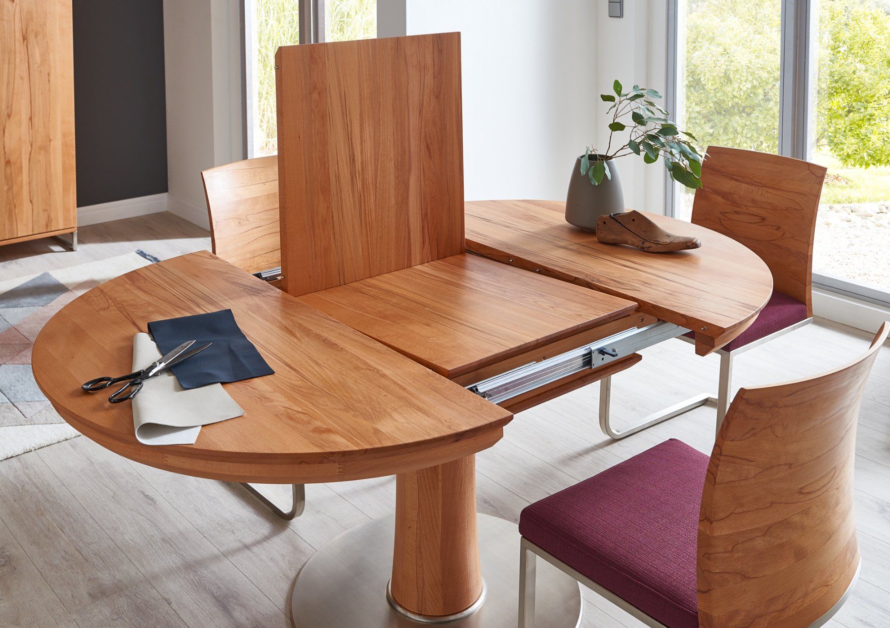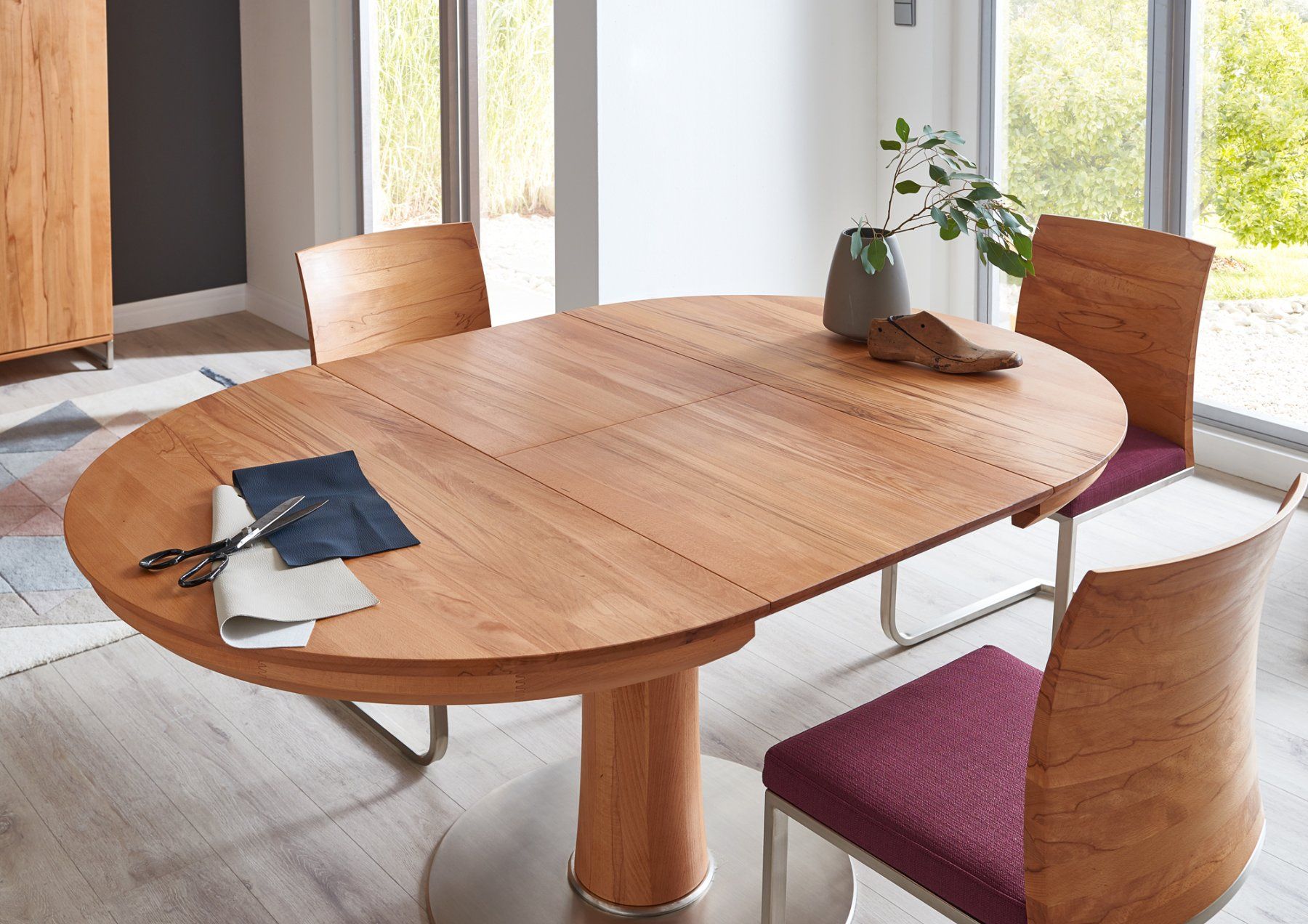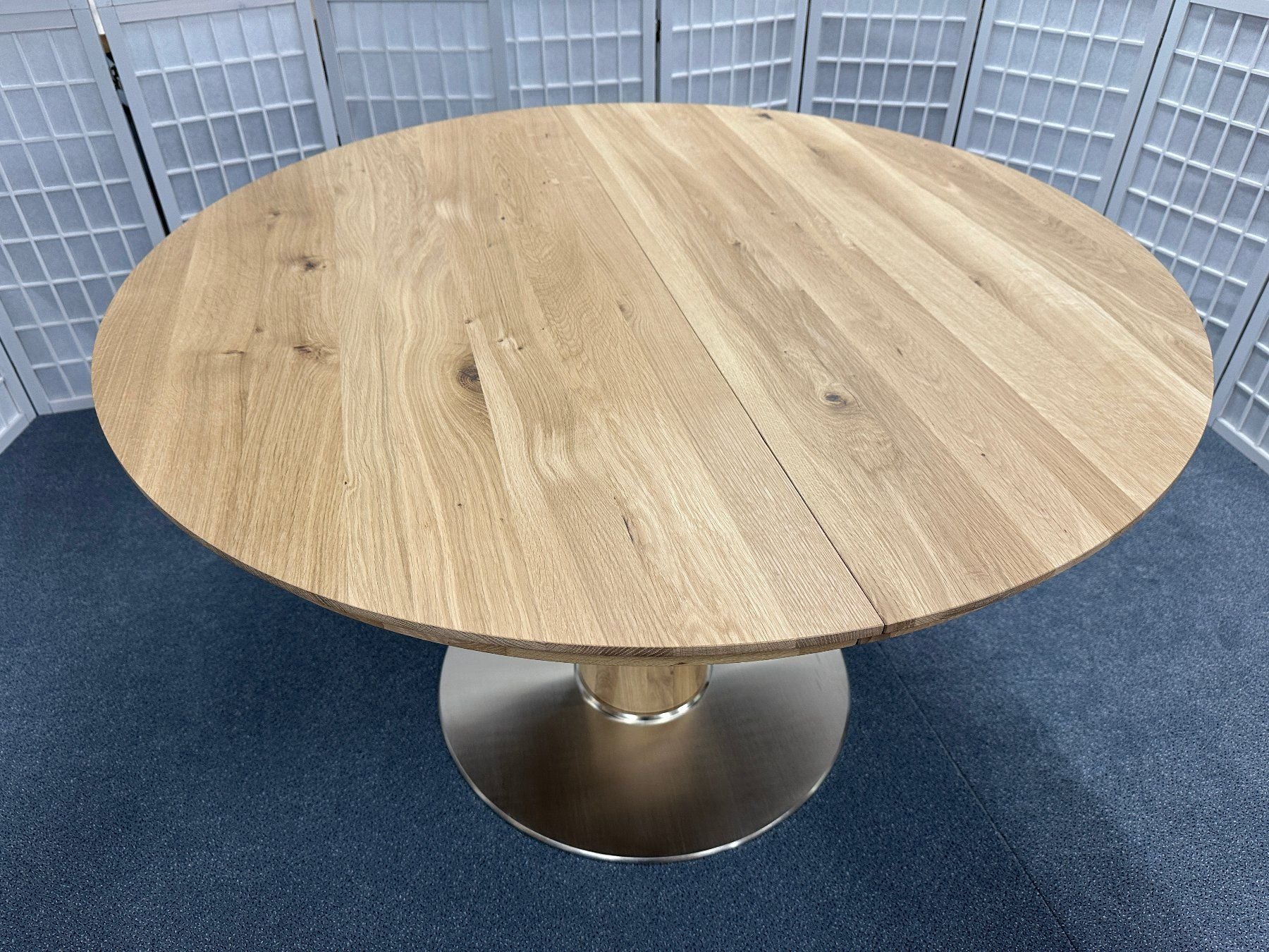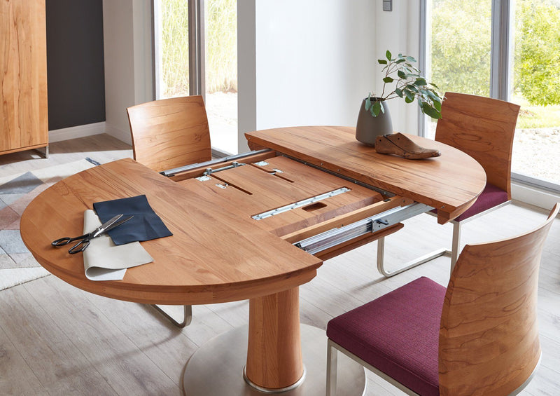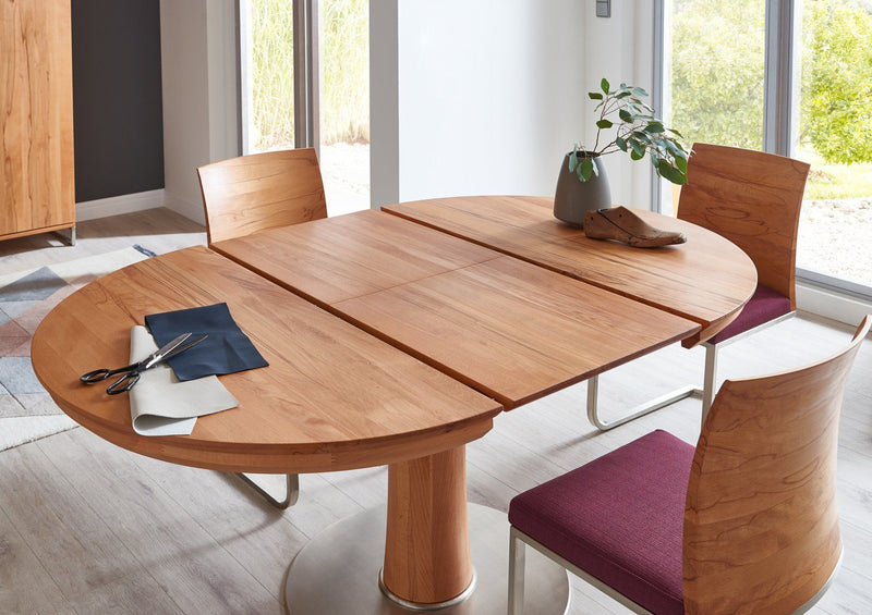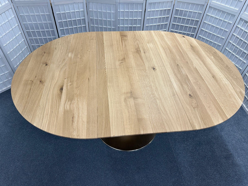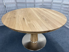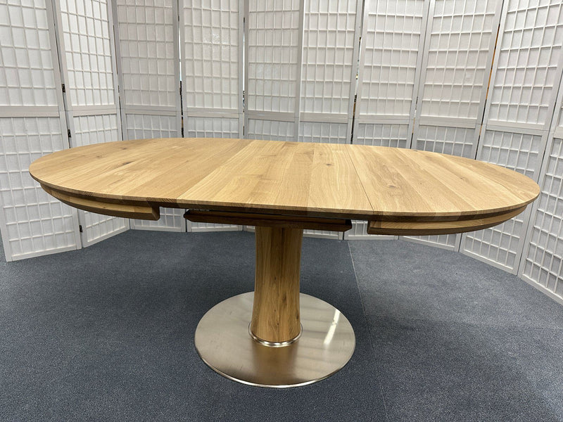 Runder Esstisch von Wimmer «Orel», rustikale Asteiche vollmassiv, Bianco (hell) geölt. Tischplattenstärke 3,0 cm, Zargenhöhe 5,0 cm, Beinfreiheit 68,0 cm, Säulenprofil Ø 22,0 cm, Bodenplatte Ø 70,0 cm, Metallausführung nickelfarbig gebürstet. Der Tisch hat eine integrierte Auszugsplatte von 55 cm, welche ganz einfach ausgeklappt werden kann.