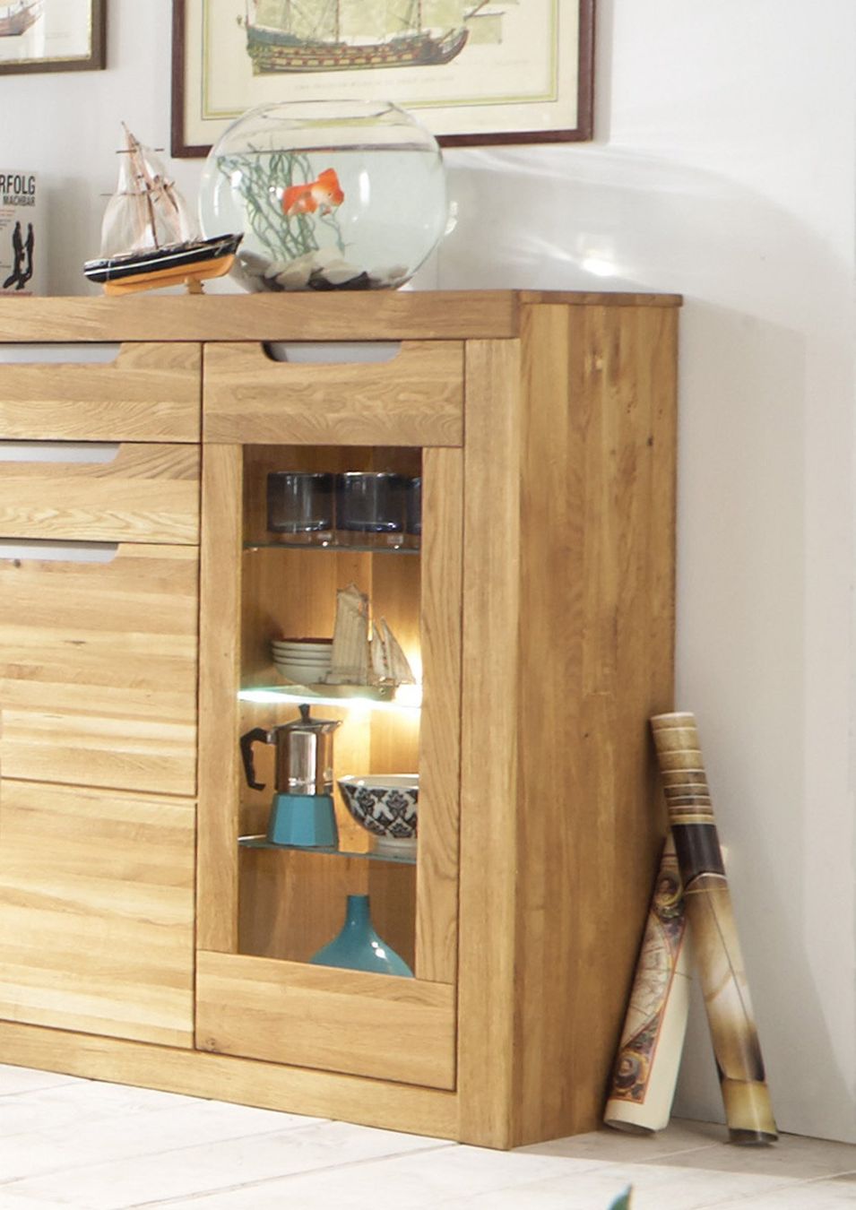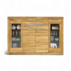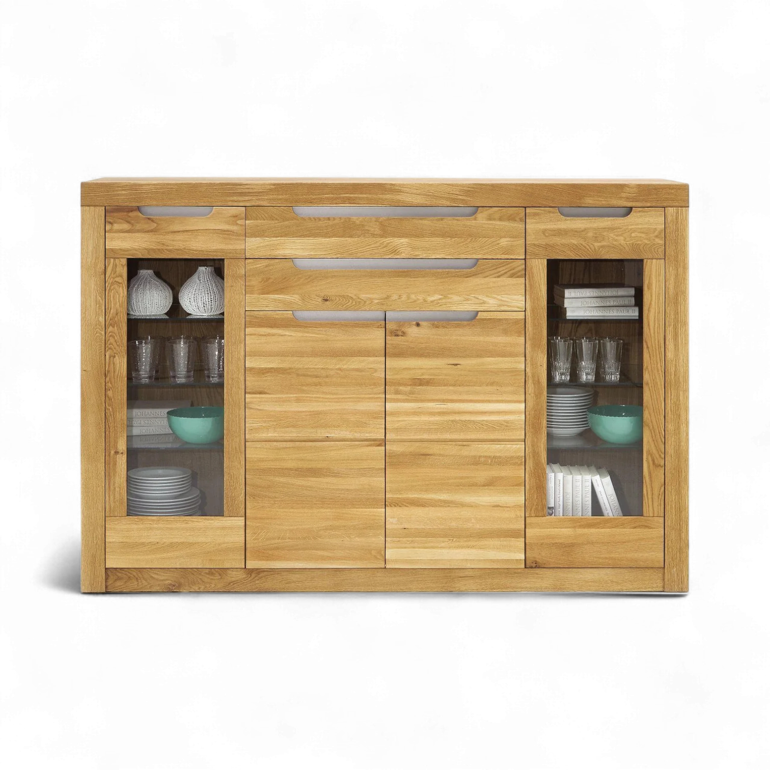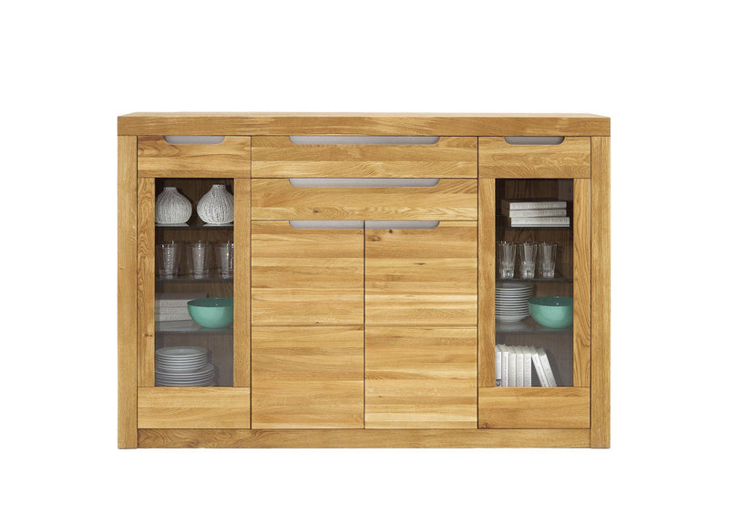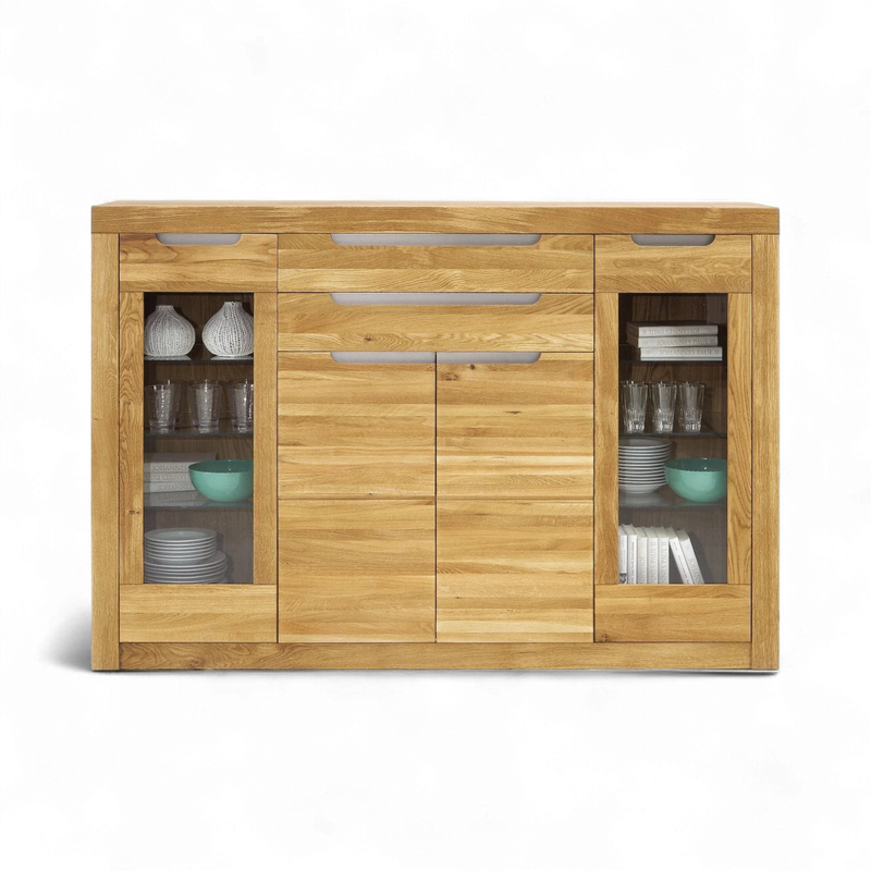 Highboard «Basel» Wildeiche massiv natur geölt. Mit 4 Türen mit LED-Glasbodenbeleuchtung und 4 Schubladen mit SoftClose.
