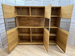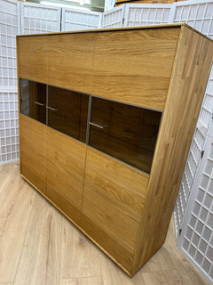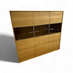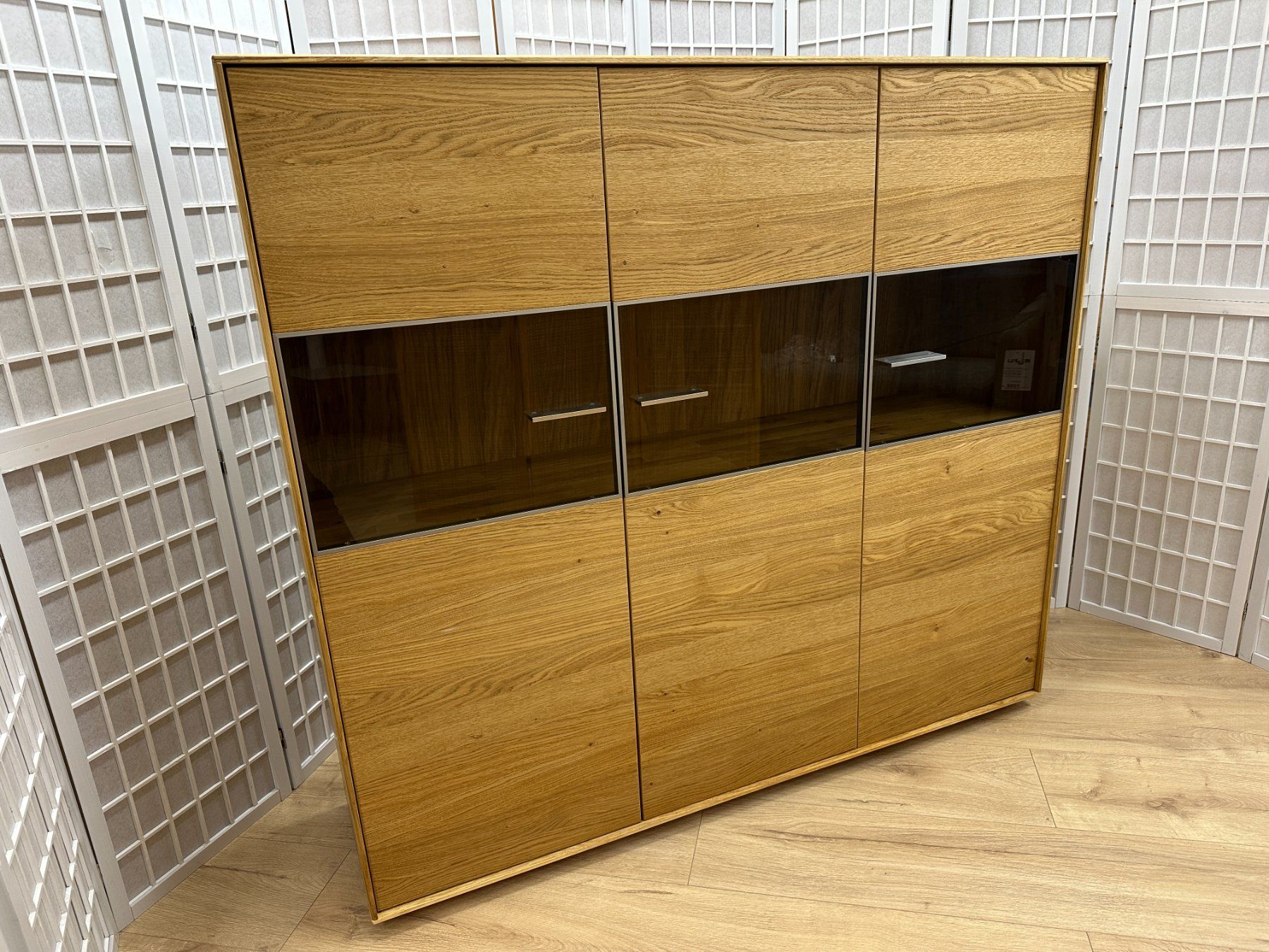 Highboard «Ori», Eiche geölt teilmassiv. Mit 3 Türen. Vitrine mit sehr dekorativer Massivholz Struktur-Rückwand.