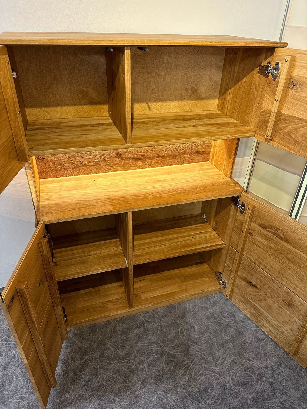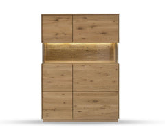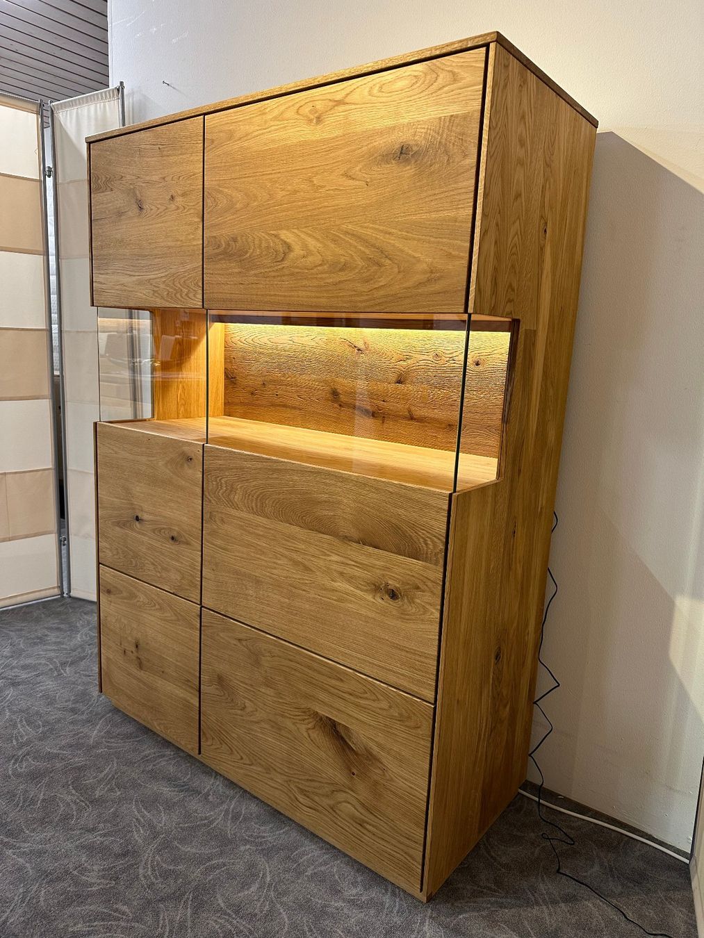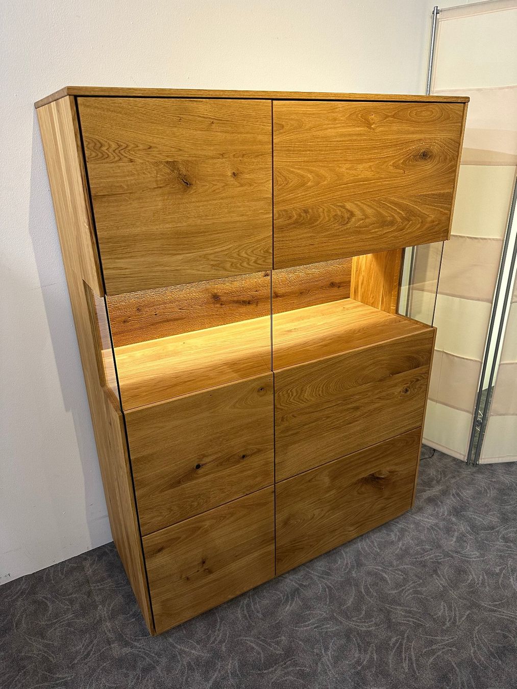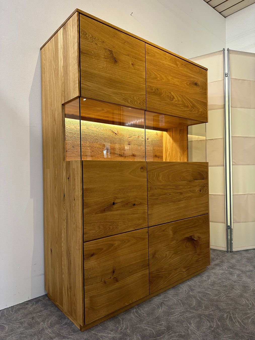 Highboard «St. Gallen», Wildeiche vollmassiv natur geölt mit Beleuchtung. 2 Türen push-to-open.