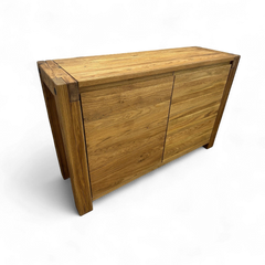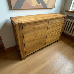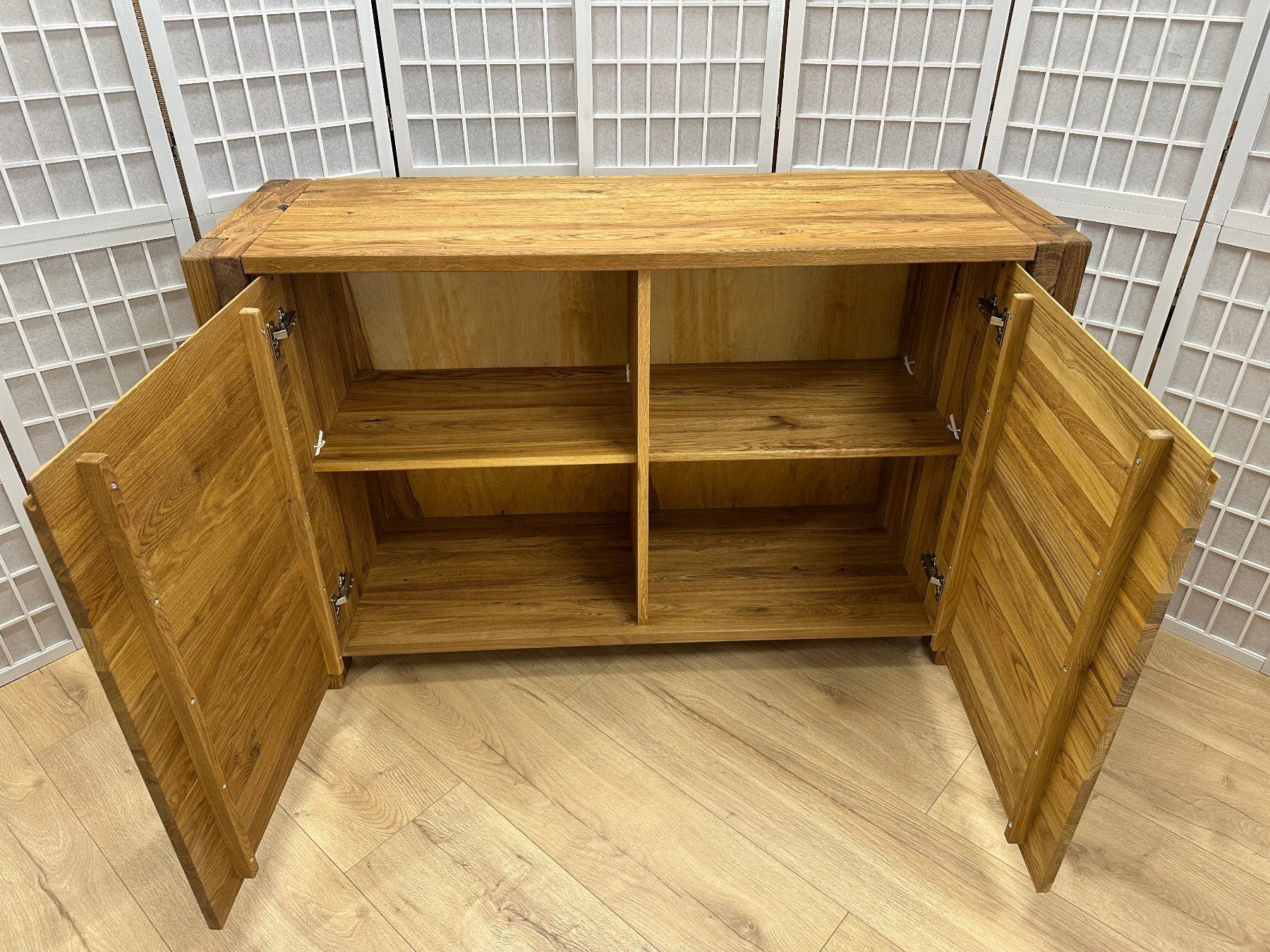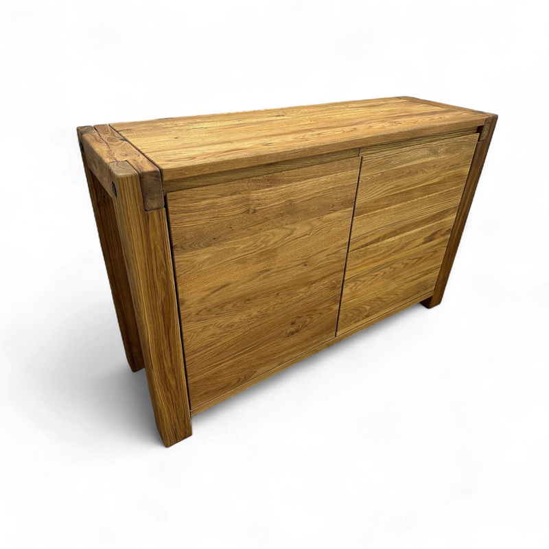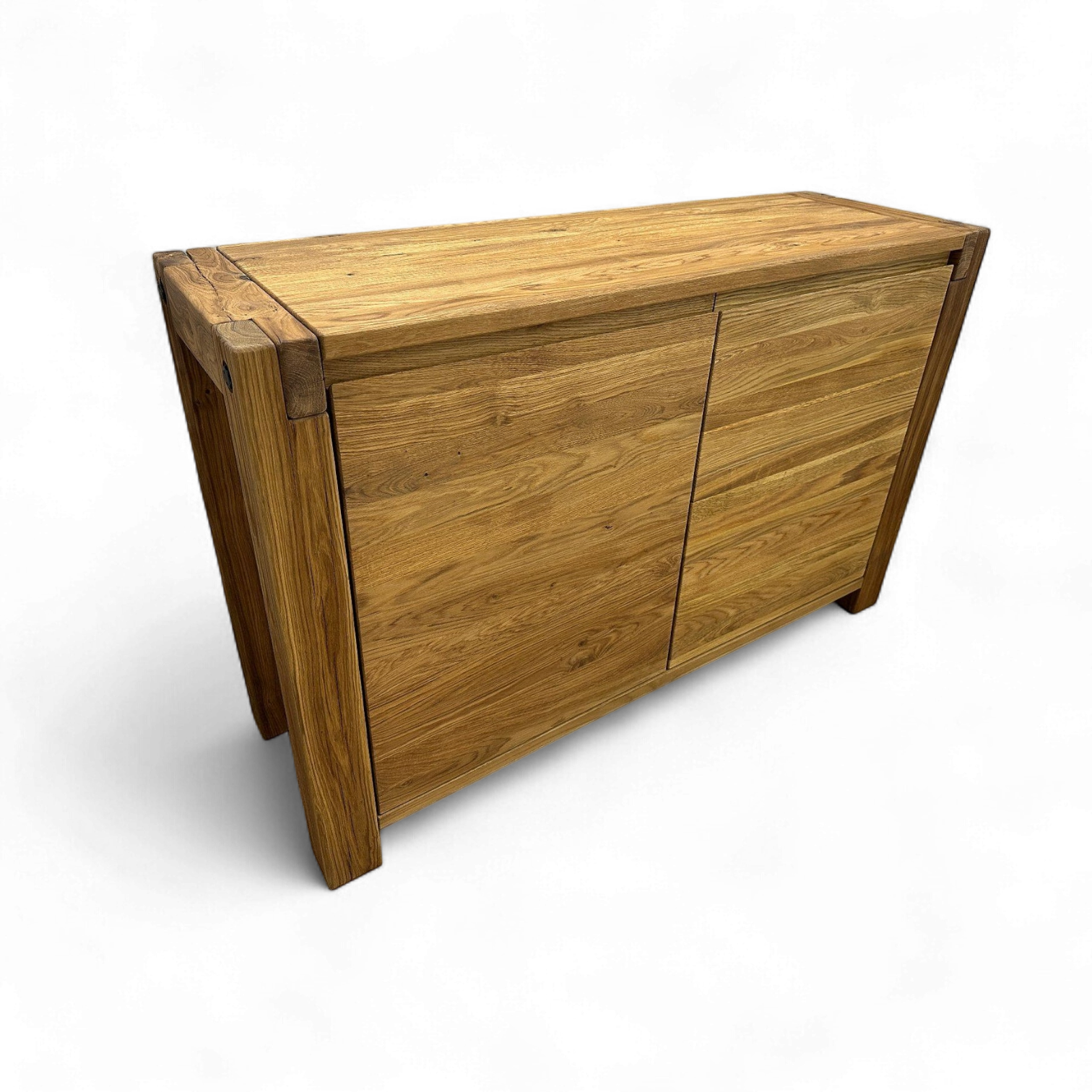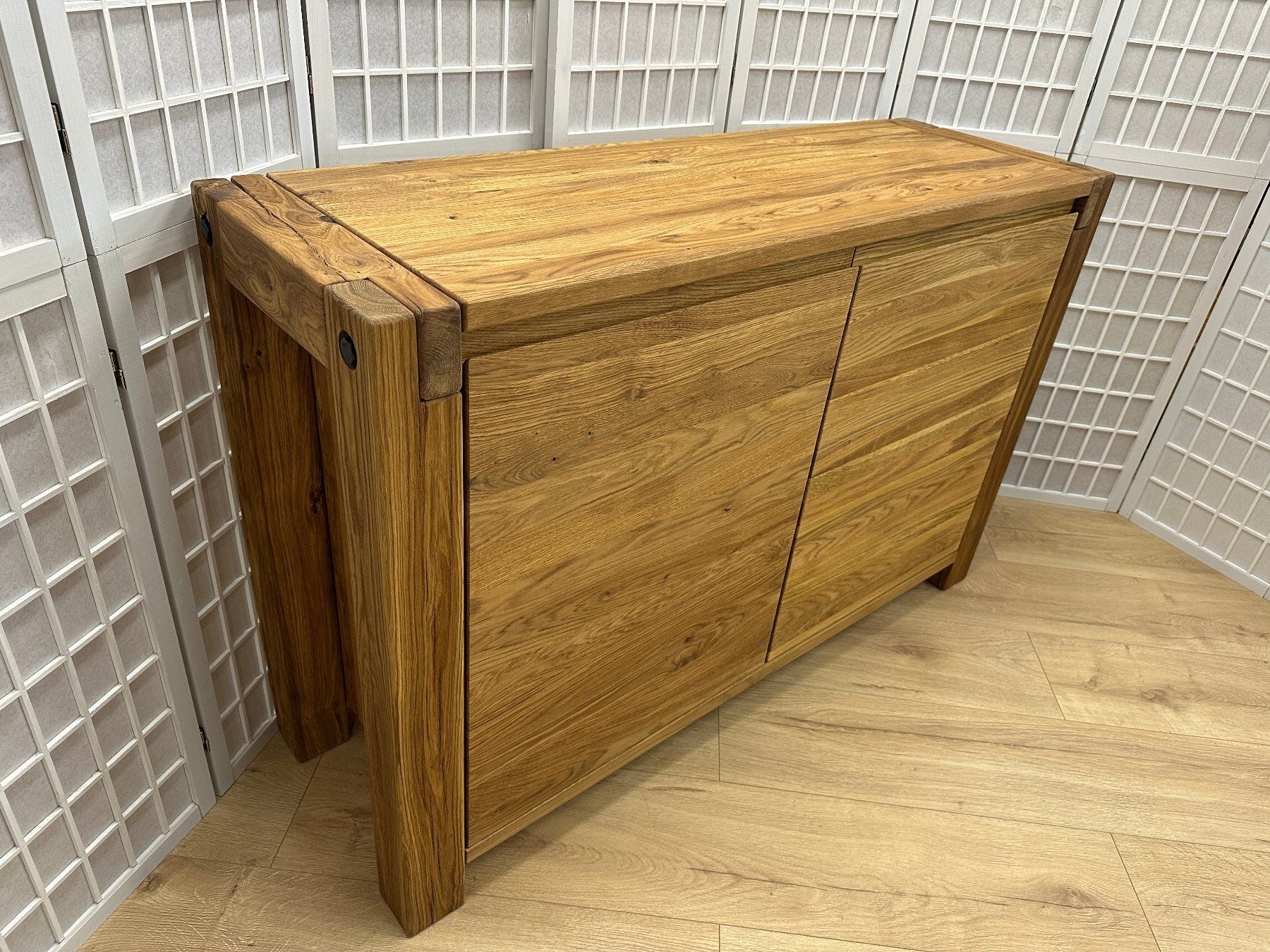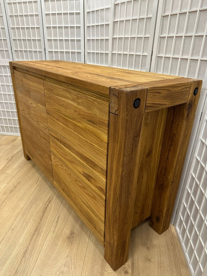 Kommode «Woodstock» in schwerer Balkenbauweise mit 2 Türen. Alle Holzelemente aufwendig in Wildeiche massiv gearbeitet und frei von Schadstoffen, gebürstet und geölt.