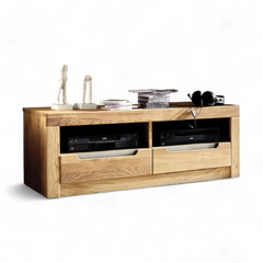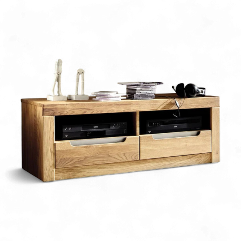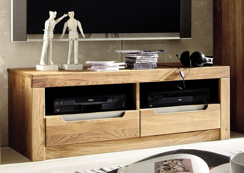 Lowboard «Basel» Wildeiche massiv natur geölt. Mit 2 offenen Fächern und 2 Schubladen mit SoftClose.