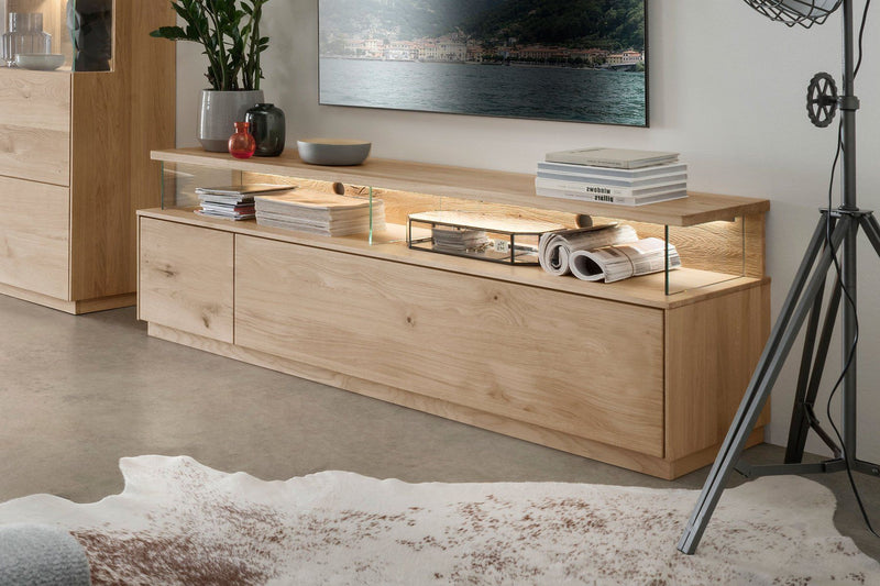 Lowboard «St. Gallen», Wildeiche vollmassiv geölt (Farbe von Bild Nr. 1 (Nr. 2 zeigt Bianco) und Beleuchtung. Mit 1 Klappe und 1 Türe.