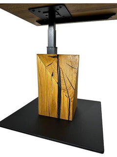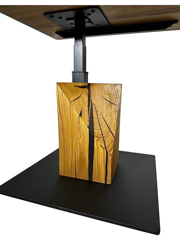 Höhenverstellbarer Couchtisch «Clarinda», Eiche massiv geölt, Metall schwarz pulverbeschichtet, Bodenplatte MDF schwarz mit Rollen.