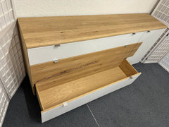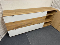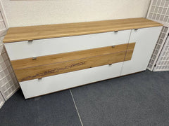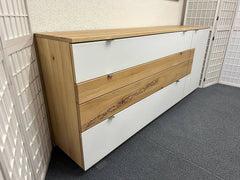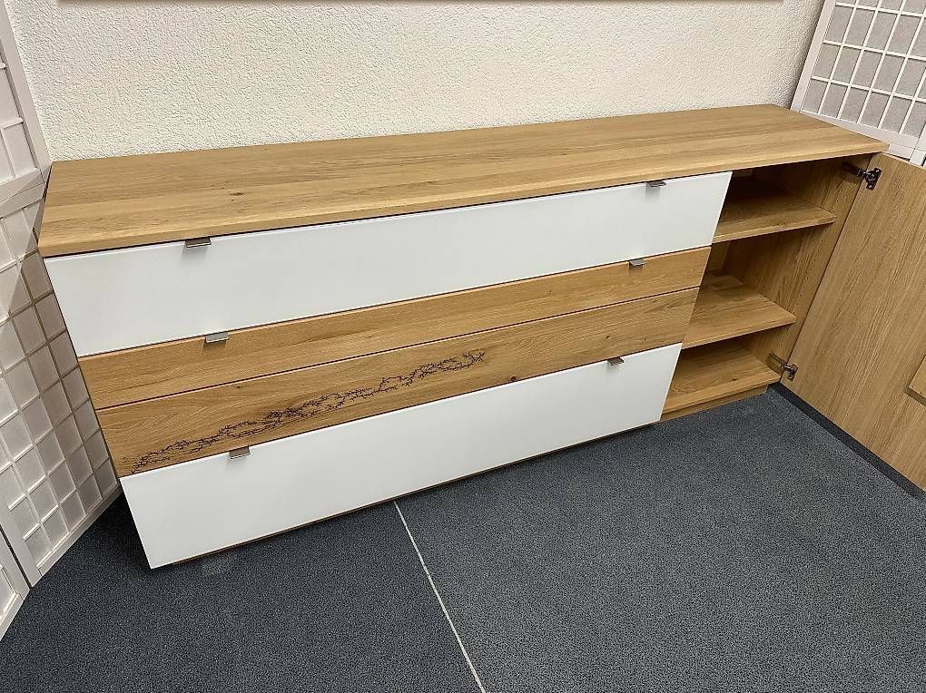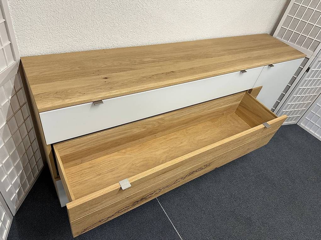 Sideboard von Wimmer «Signatura» rust. Asteiche vollmassiv Bianco geölt, satiniertes Glas weiss.