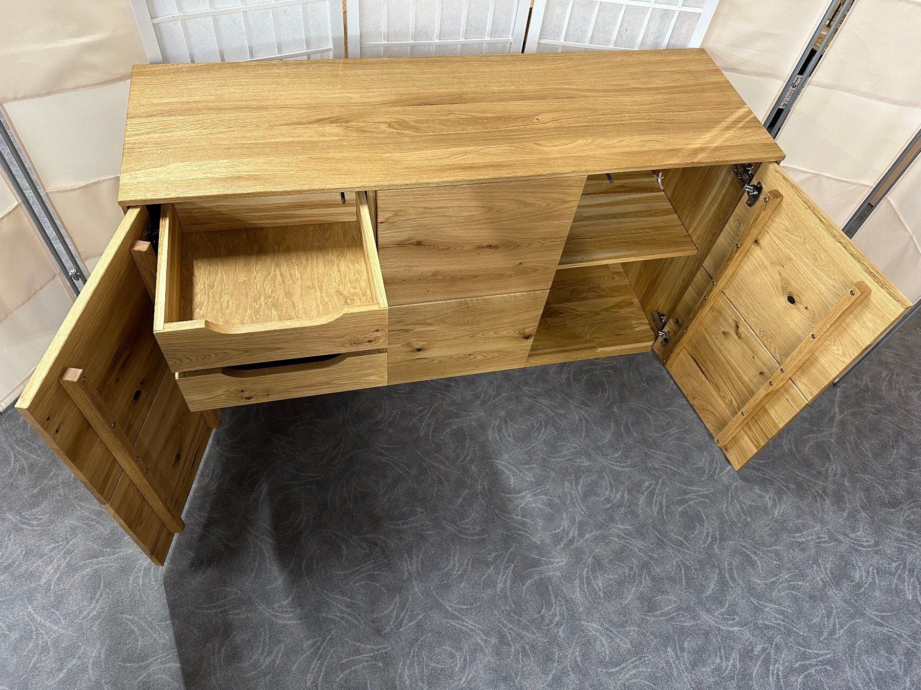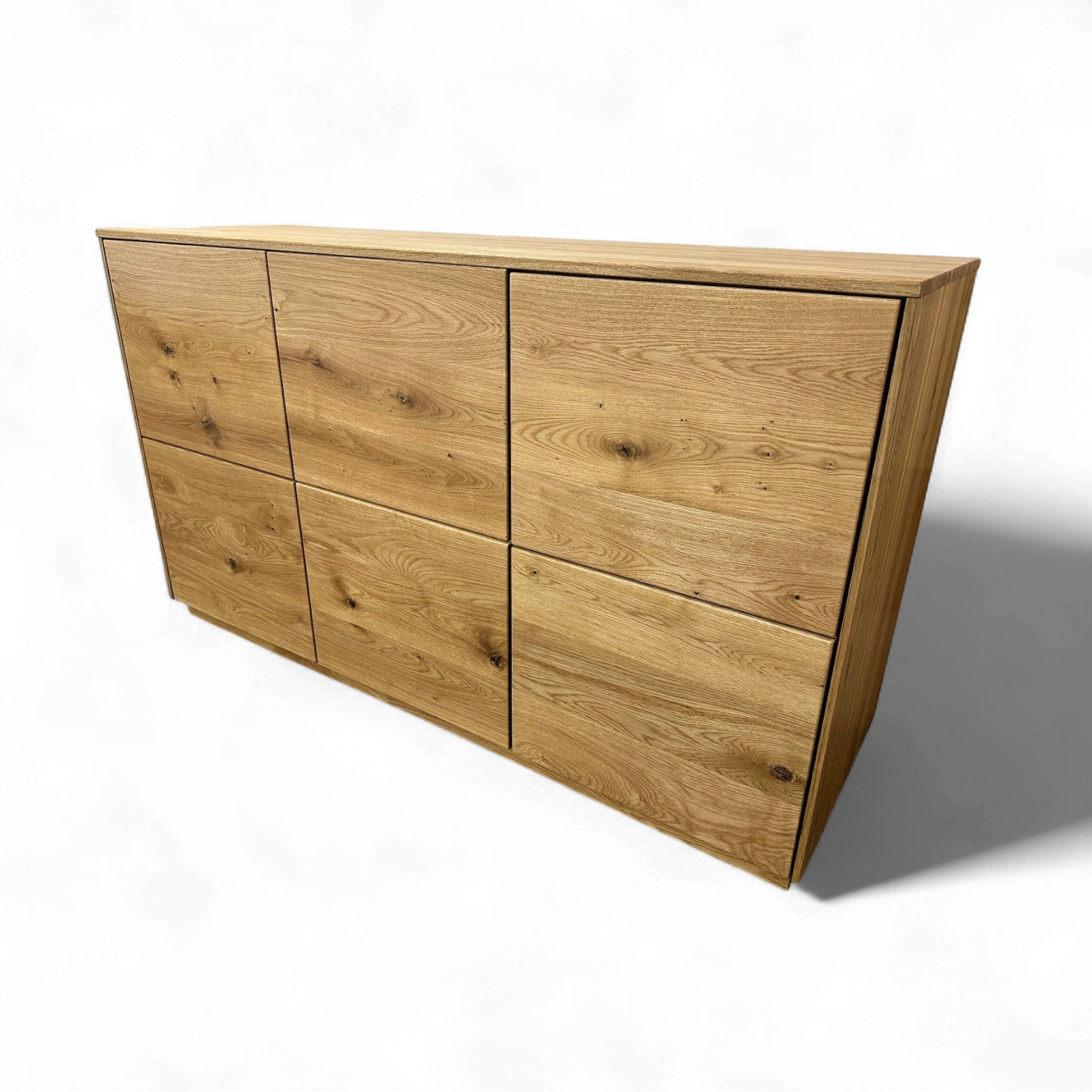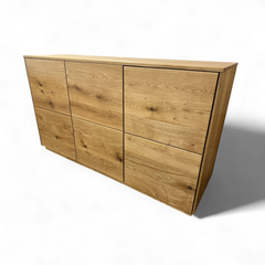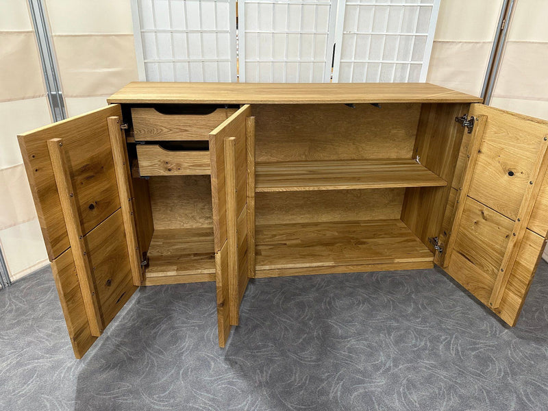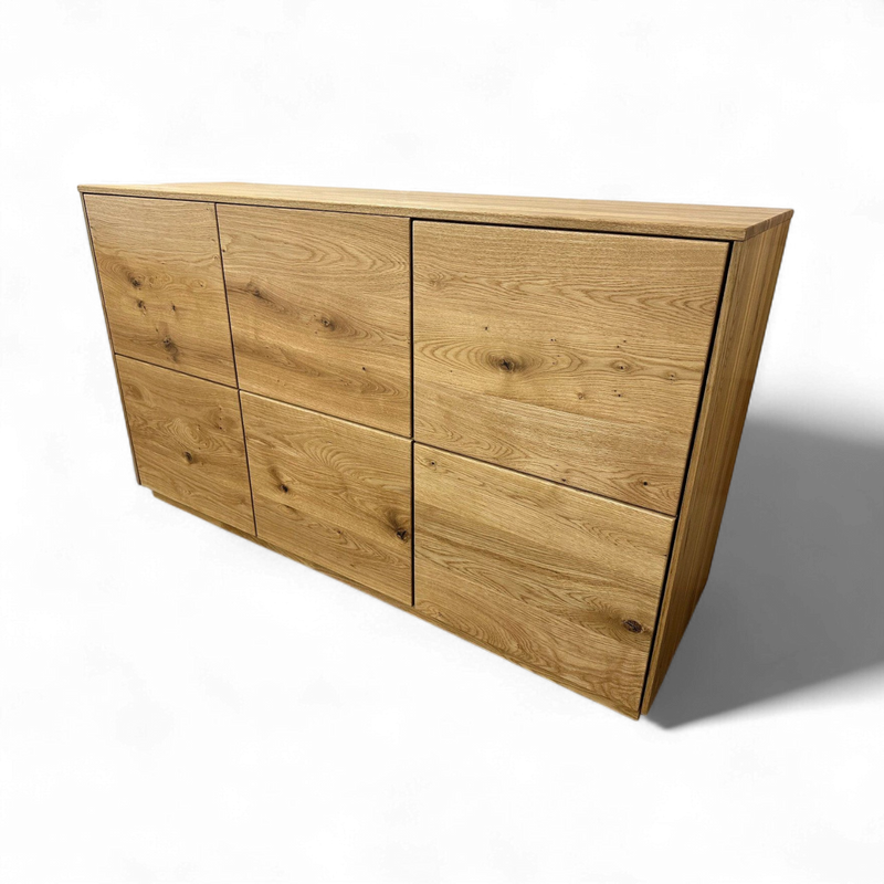 Sideboard «St. Gallen», Wildeiche vollmassiv geölt. Mit 3 Türen Push to open und 2 Innen-Schubladen mit Vollauszug und Selbsteinzug.