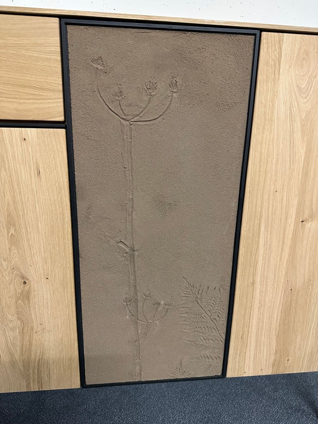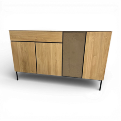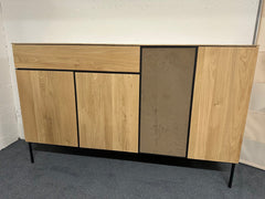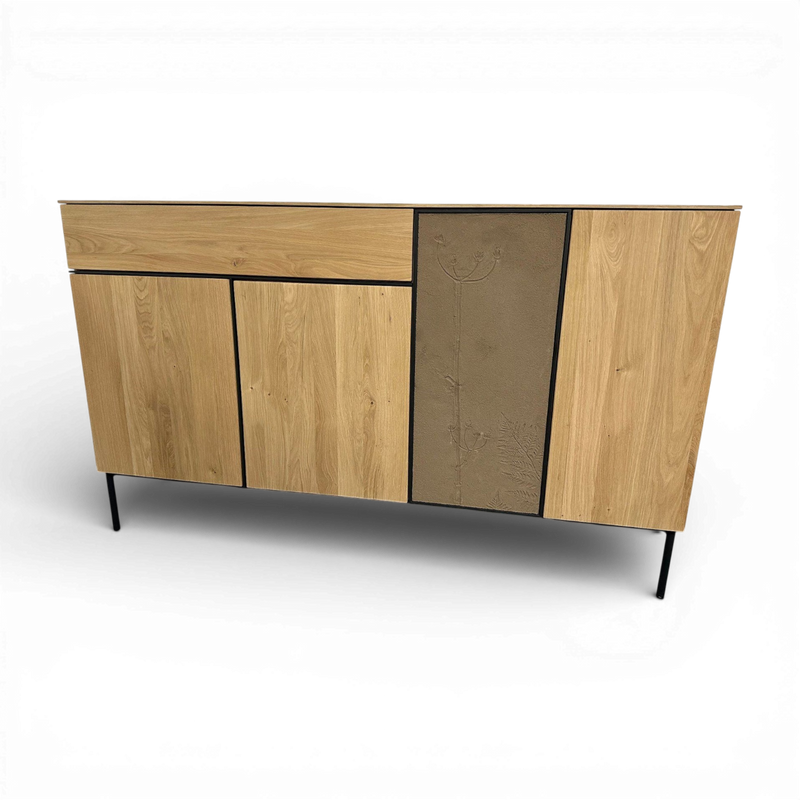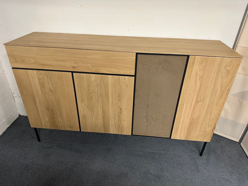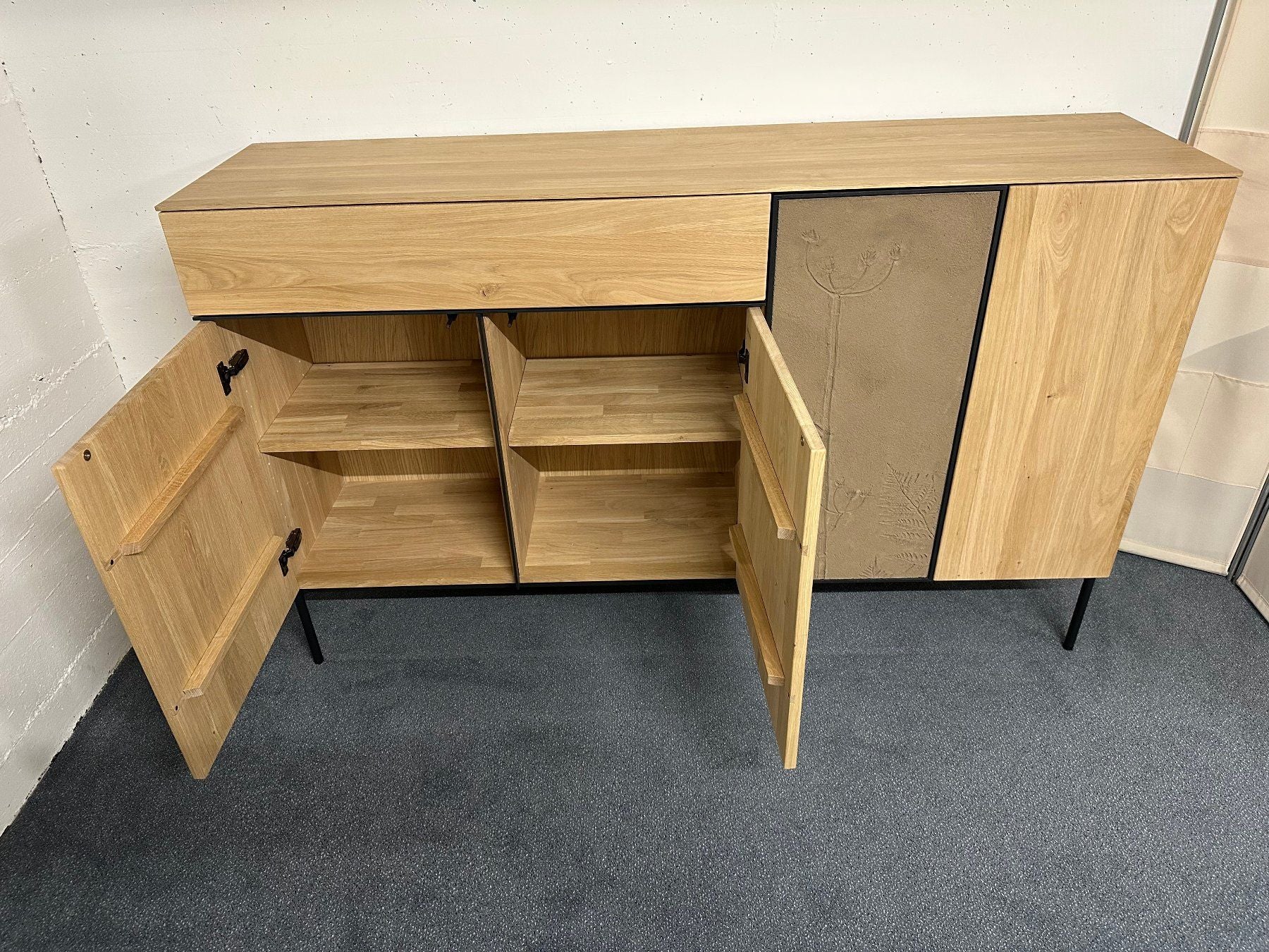 Sideboard «Terrafine» von Wimmer, rust. Asteiche vollmassiv Bianco geölt, Metall RAL7021 schwarzgrau. 4 Türen und 1 Schublade mit Tip-on. Eine Türe verfügt über eine Lehmfront mit floralem Muster.