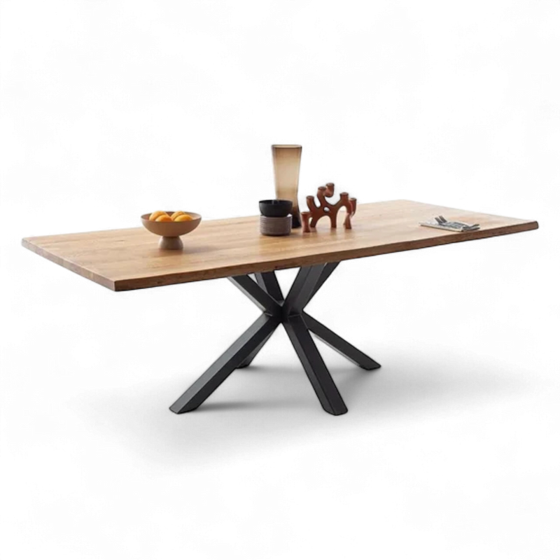 Tisch «Deba» Wildeiche vollmassiv, natur geölt. Plattenstärke 40 mm aufgedoppelt, Baumkante. Tischplatte streifenverleimt (durchgehende Lamelle, keine Parkettverleimung). Spider-Füsse Metall schwarz pulverbeschichtet. Tischhöhe 76 cm.