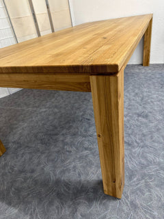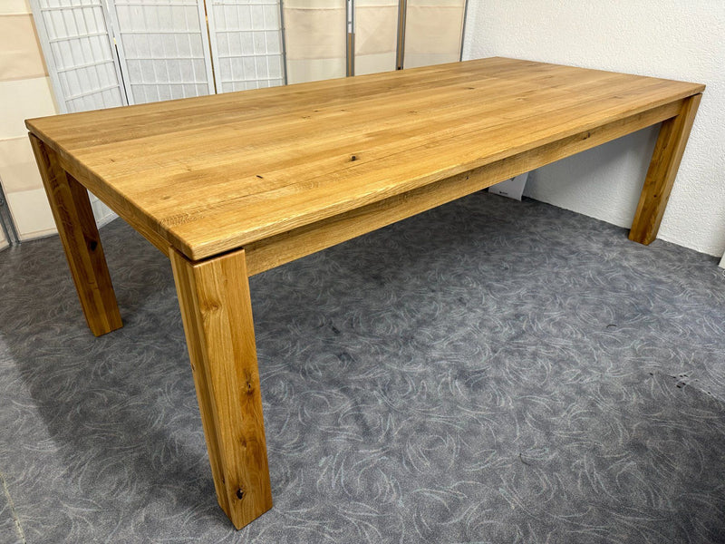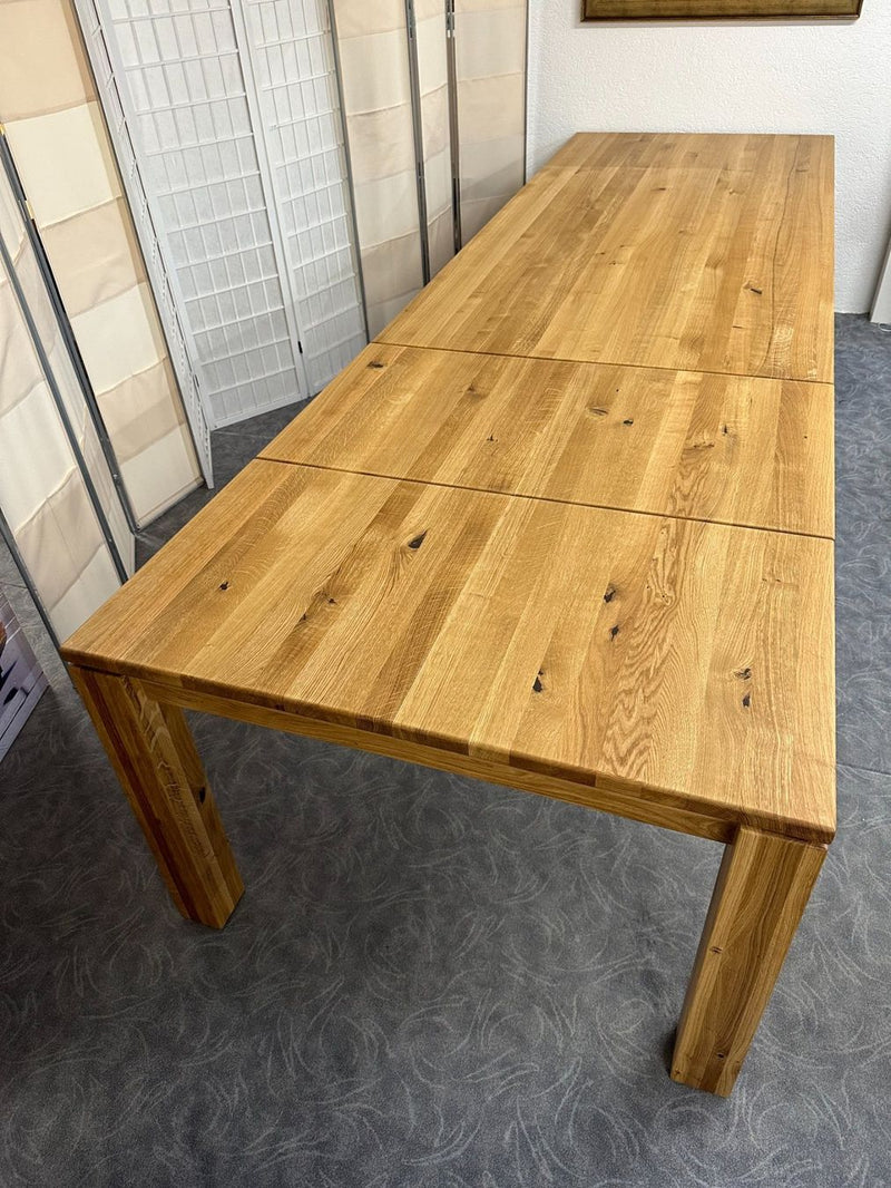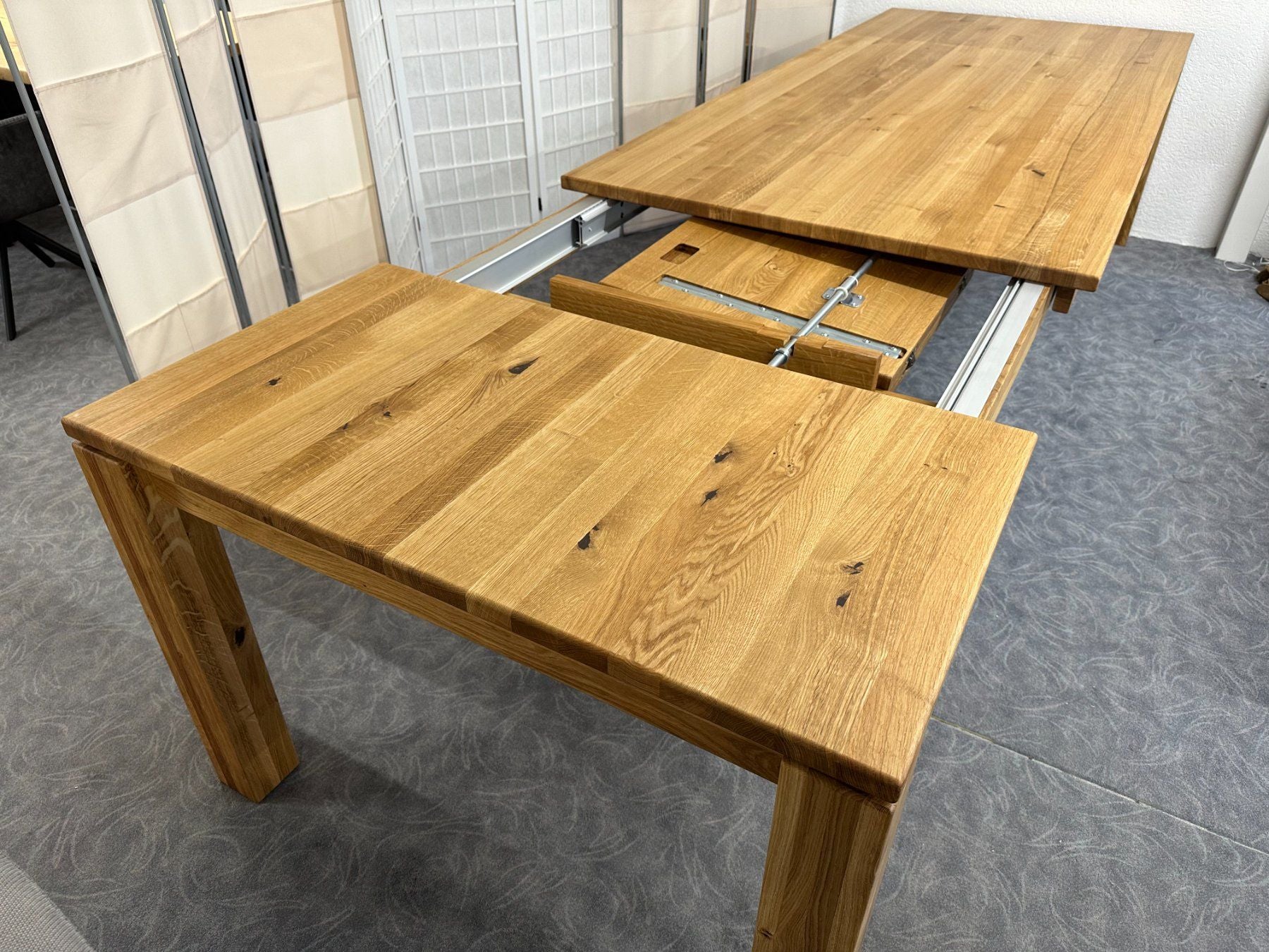 Esstisch «Ideal» von Wimmer. Rust. Asteiche vollmassiv geölt, Beinprofil 10 x 10 cm, Plattenstärke 3 cm, Beinfreiheit ca. 64 cm. Der Tisch hat zwei integrierte Auszugsplatten von je 60 cm, welche ganz einfach ausgeklappt werden können (auch einzeln).