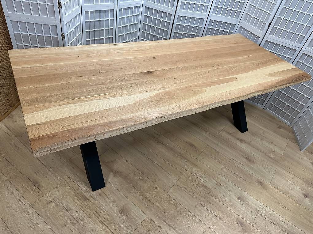 Tisch «Palmira» Zerreiche vollmassiv, natur geölt. Plattenstärke 40 mm aufgedoppelt, Baumkante. Tischplatte streifenverleimt (durchgehende Lamelle, keine Parkettverleimung).