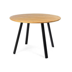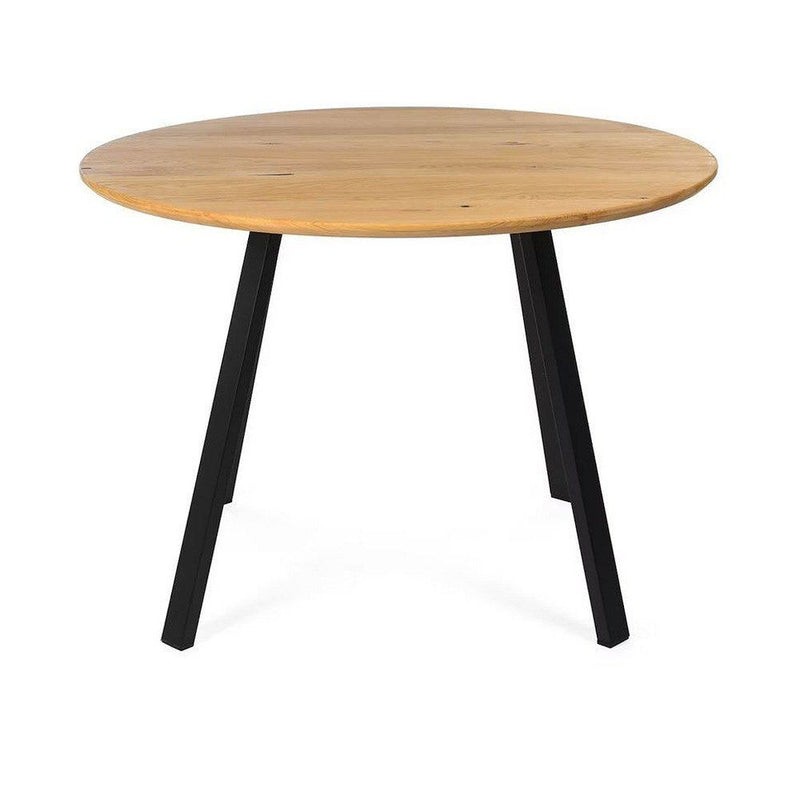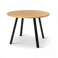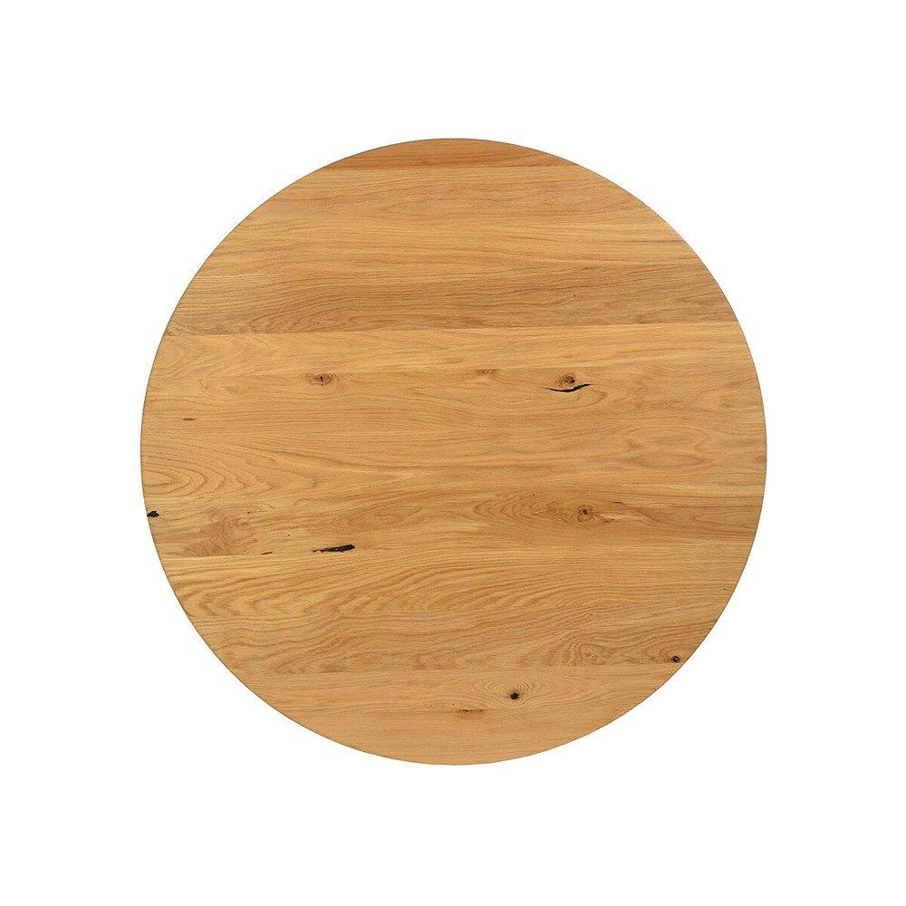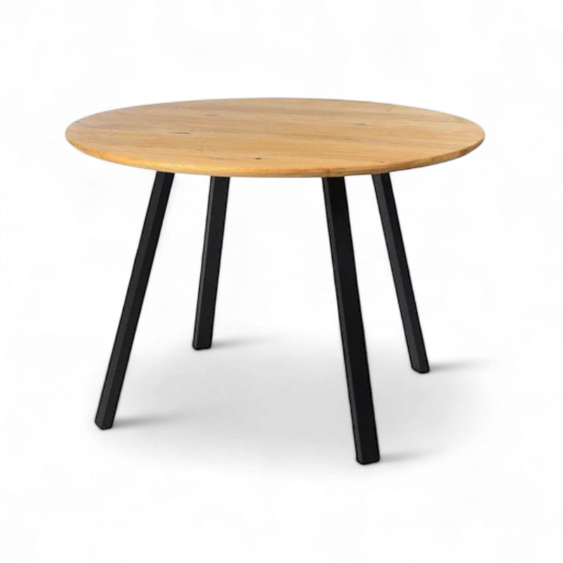 Tisch «Thomas» Wildeiche massiv geölt, streiffenverleimt. Beine Metall schwarz pulverbeschichtet.