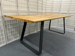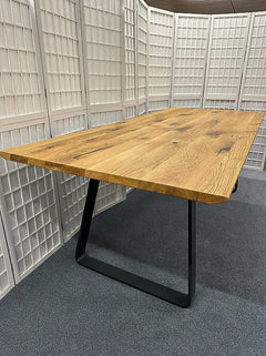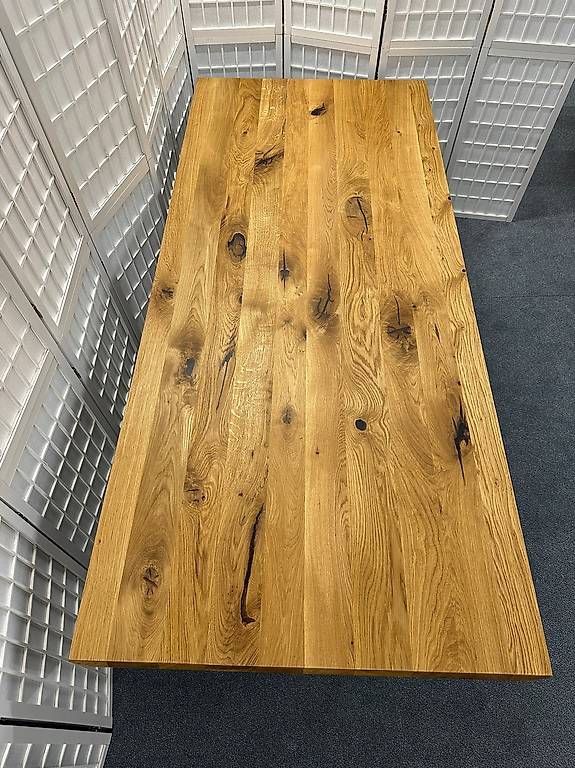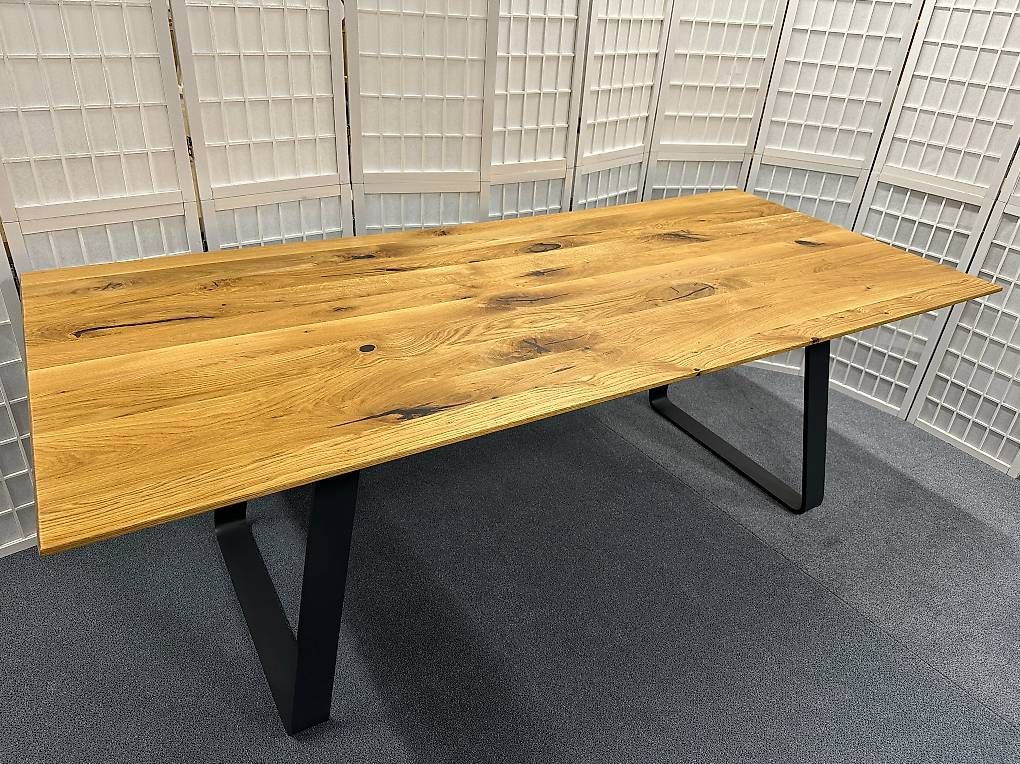 Esstisch von Wimmer «Zweigl Z51» rustikale Asteiche vollmassiv geölt. Äste sind mit Epoxidharz gefüllt. Schweizer Kante, Plattenstärke 3 cm, Stahlkufen RAL7021 Schwarzgrau.